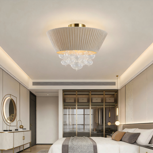 Podczas swojej długoterminowej działalności na rynku europejskim i amerykańskim firma Strong Lighting zawsze zwracała szczególną uwagę na potrzeby estetyczne i scenariusze użytkowania użytkowników końcowych. Klosz z tkaniny tej lampy sufitowej wykonany jest techniką ręcznego tłoczenia tekstury, tworząc naturalną i trójwymiarową plisowaną fakturę. Emitowane przez nią światło jest miękkie i równomiernie rozłożone, tworząc ciepłe i komfortowe środowisko oświetleniowe. Wiszące poniżej szklane bańki są ręcznie dmuchane, każda ma nieco inny kształt. Po zapaleniu wyglądają jak zawieszone w powietrzu koraliki świetlne, prezentując dynamiczny i czarujący efekt światła i cienia. Niezależnie od tego, czy zostanie zastosowany w skandynawskiej, minimalistycznej przestrzeni mieszkalnej, czy w miejscu komercyjnym o lekkim, luksusowym stylu, może znacznie poprawić jakość przestrzeni.