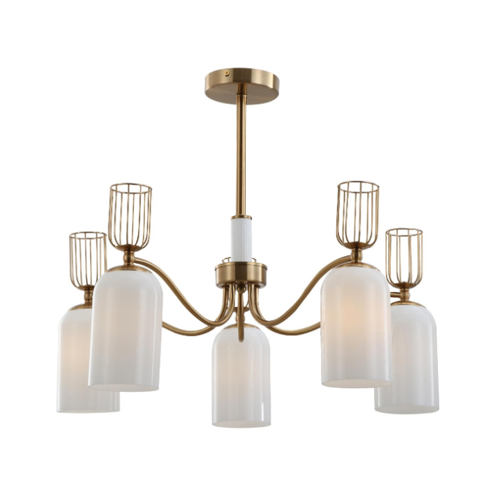 Idealny do przestrzeni o niskim suficie, mocne oświetlenie najnowsze retro 5-lekkie mleczne szklane szklane żyrandol łączy kompaktową stylizację retro z funkcjonalnością premium. Wyposażony w pięć szklanych szklanych szklanek w kształcie kopuły, ozdobne metalowe akcenty i szczotkowane miedziane wykończenie, to urządzenie zapewnia miękkie, skoncentrowane oświetlenie idealne do przytulnych kuchni, kawiarni lub kawiarni w stylu vintage. Globalnie certyfikowany (CE, UL, ROHS) i dostosowywany dla zamówień masowych.